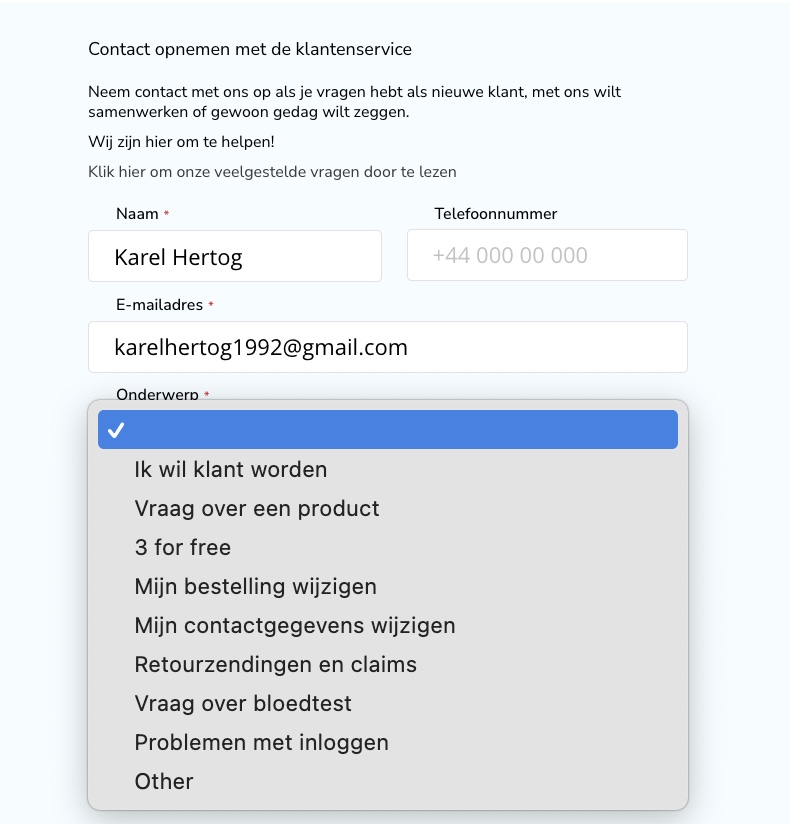 Hier vindt u een formulier dat u kunt invullen en waarmee u uw vraag kunt indienen. In het veld "Onderwerp" vindt u de meest voorkomende vraagcategorieën waaruit u kunt kiezen.