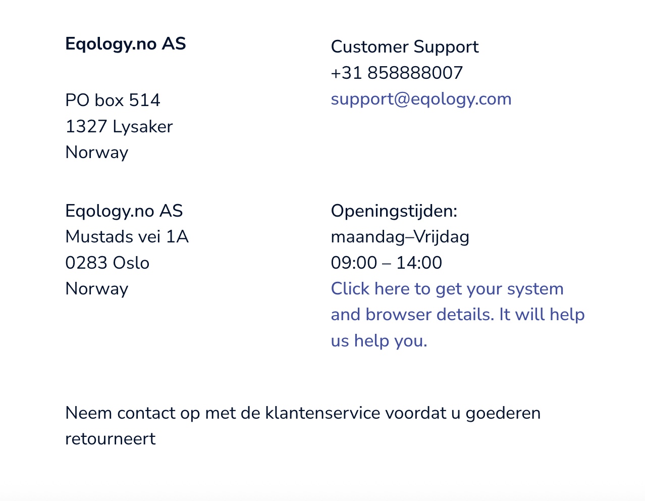 U kunt onderstaande richtlijnen volgen om er zeker van te zijn dat uw vragen zo snel mogelijk worden beantwoord wanneer u contact opneemt met de klantenservice van Eqology.