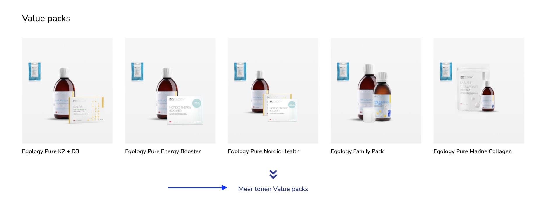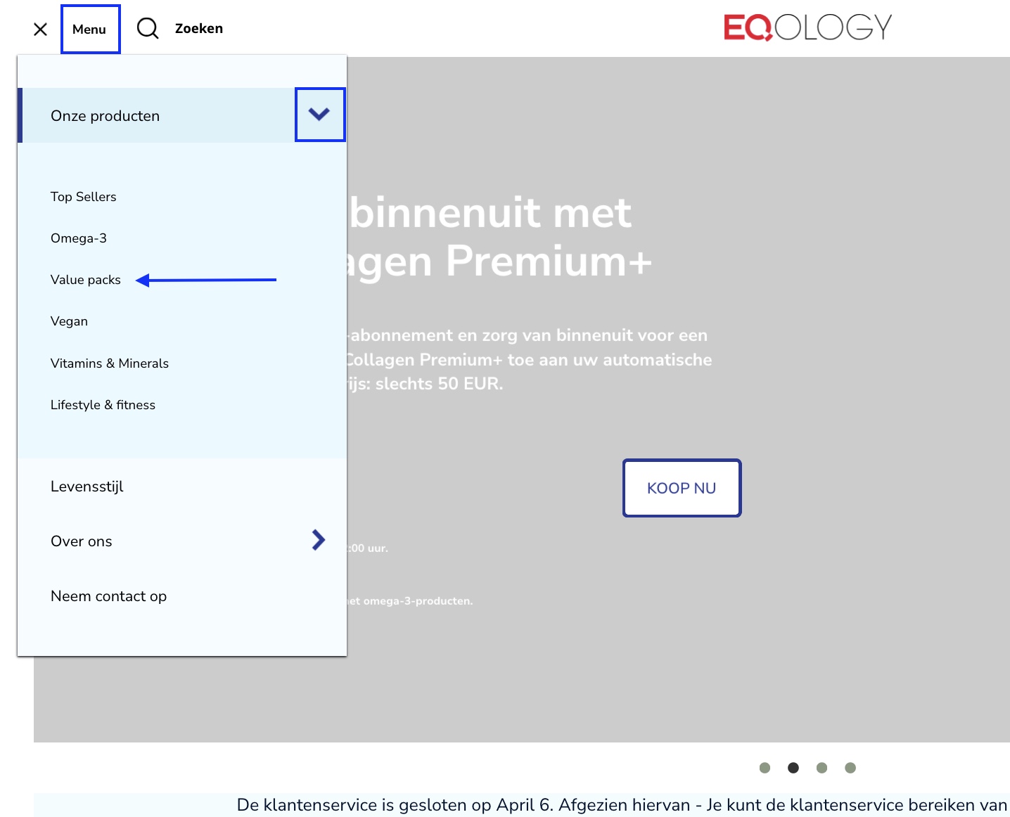 Om Value packs te vinden, klikt u op "Menu" in de linkerbovenhoek en vervolgens op het pijltje naast "Onze producten". Daarna klikt u op "Value packs":