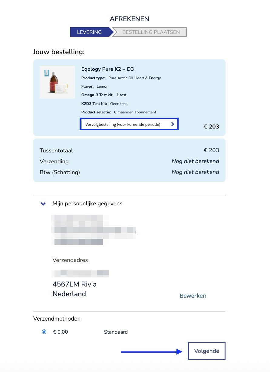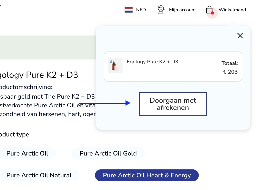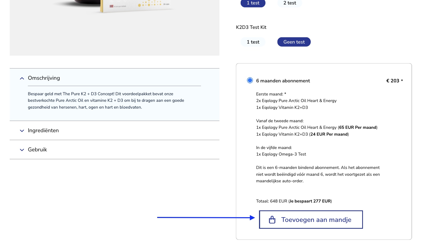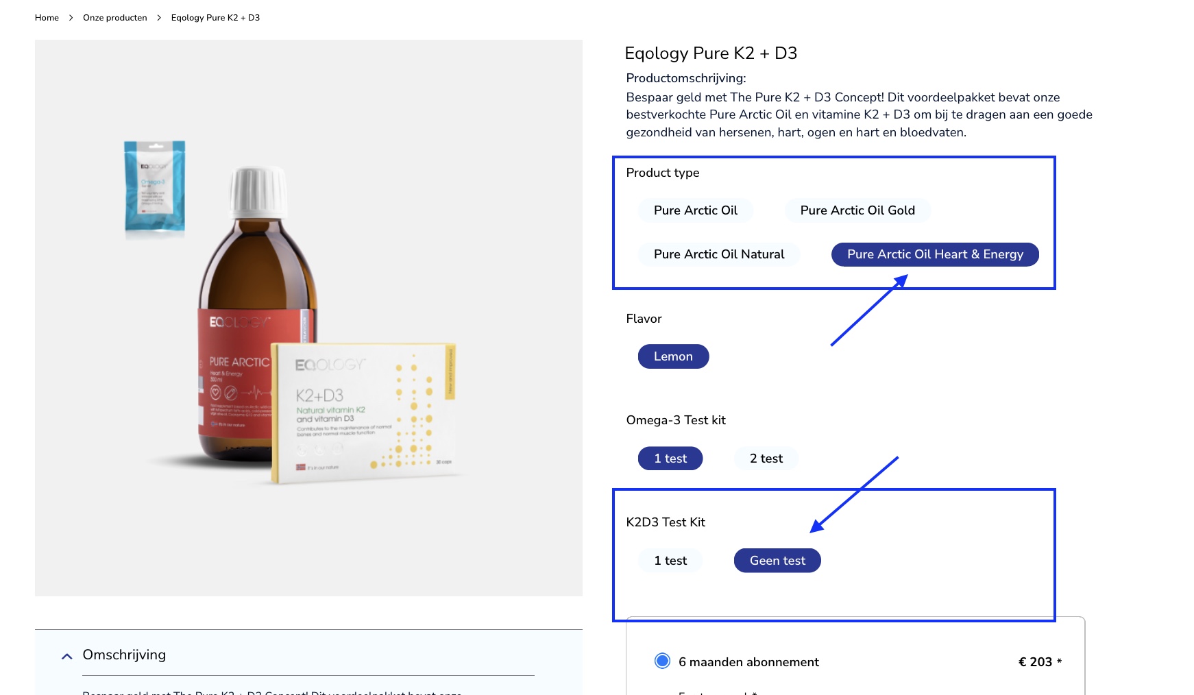 Klik eerst bij het producttype op "Pure Arctic Oil Heart & Energy". Ga daarna naar de K2+D3-test en klik op "Geen test":