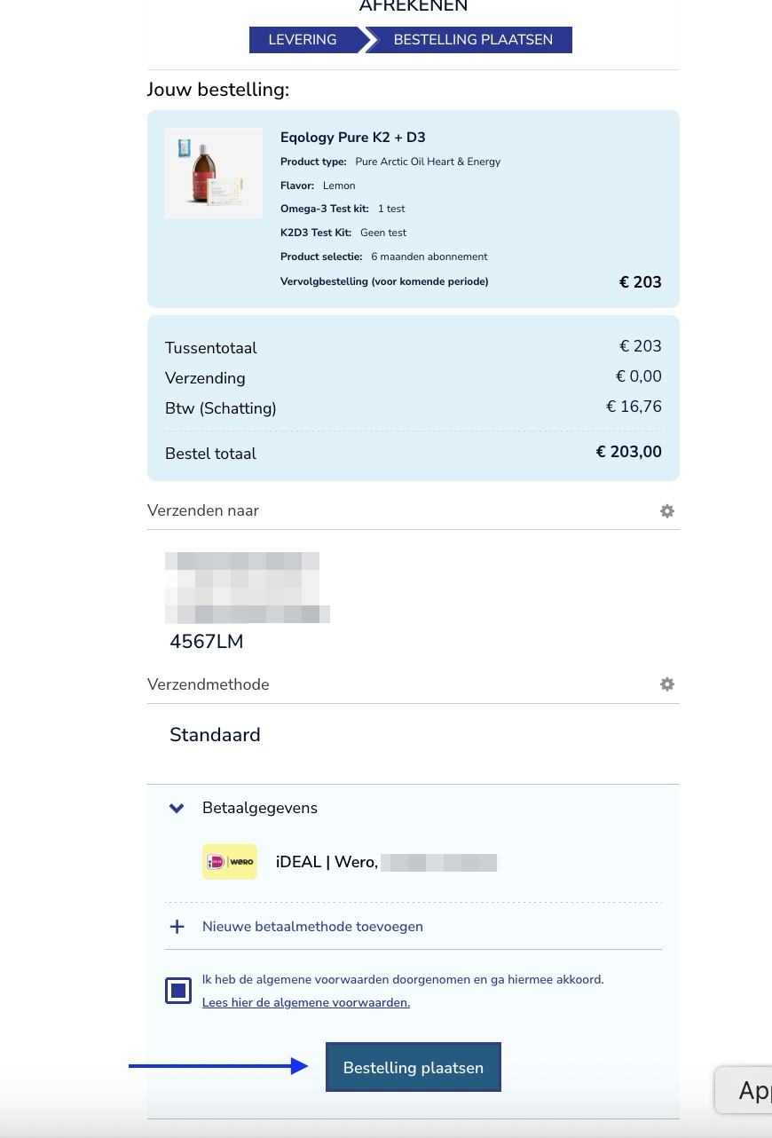 Het laatste wat u moet doen, is klikken op de knop "Bestelling plaatsen" onderaan de pagina. Zorg er ook voor dat u de algemene voorwaarden leest en accepteert.