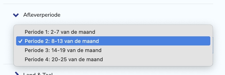 Hier kunt u uw standaard leveringsperiode instellen. Kies de periode die het beste bij u past.