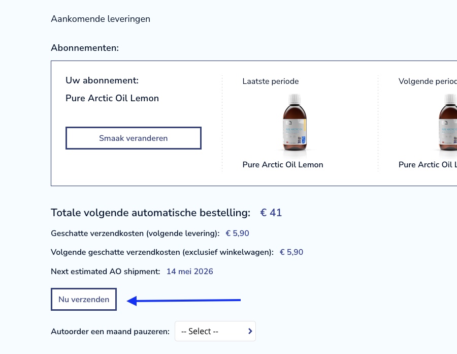 Let op: door op “nu verzenden” te klikken, verwerkt u de gehele automatische bestelling direct. Dit betekent dat alle producten die aan uw automatische bestelling zijn toegevoegd, worden verzonden.