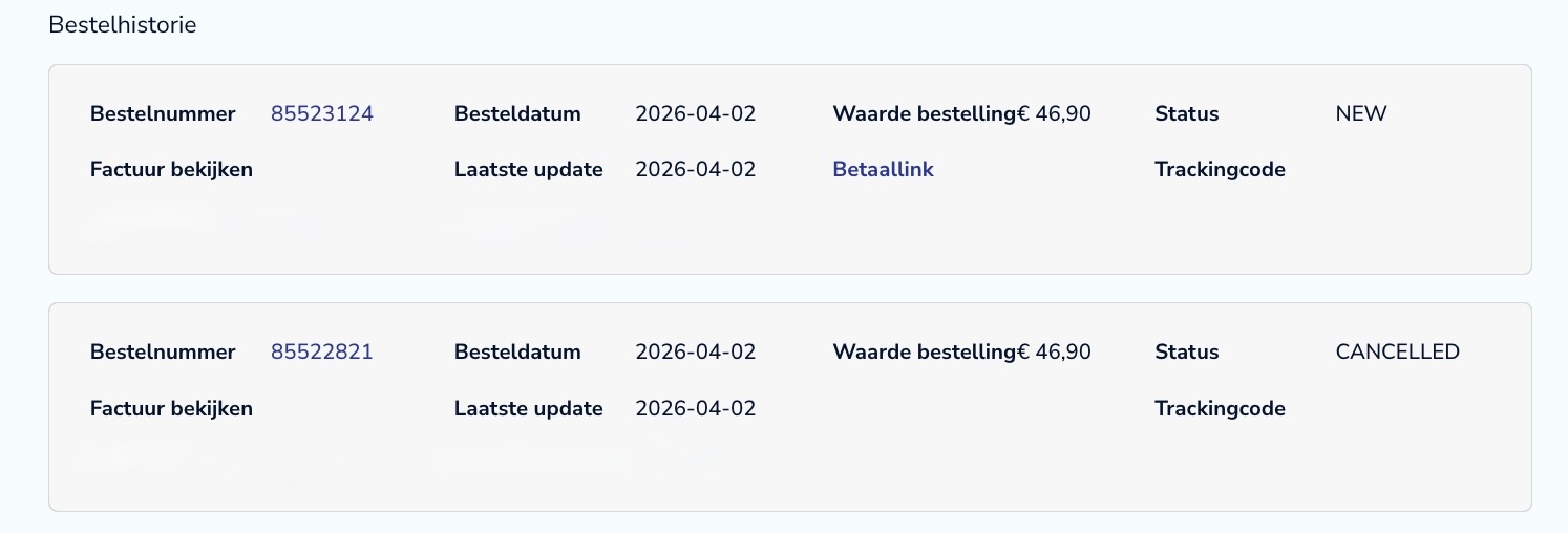 Afhankelijk van uw betaalmethode ontvangt u ofwel een betaallink, of een bevestiging dat de bestelling is betaald en binnenkort wordt verzonden. U kunt uw bestellingen altijd terugvinden in uw bestelgeschiedenis: