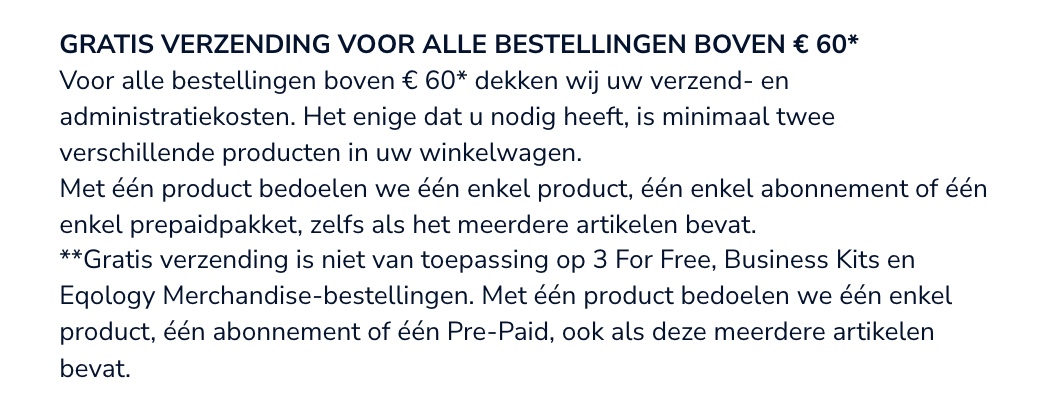 Let op: gratis verzending is niet van toepassing op bestellingen van 3 For Free, Business Kits en Eqology Merchandise.