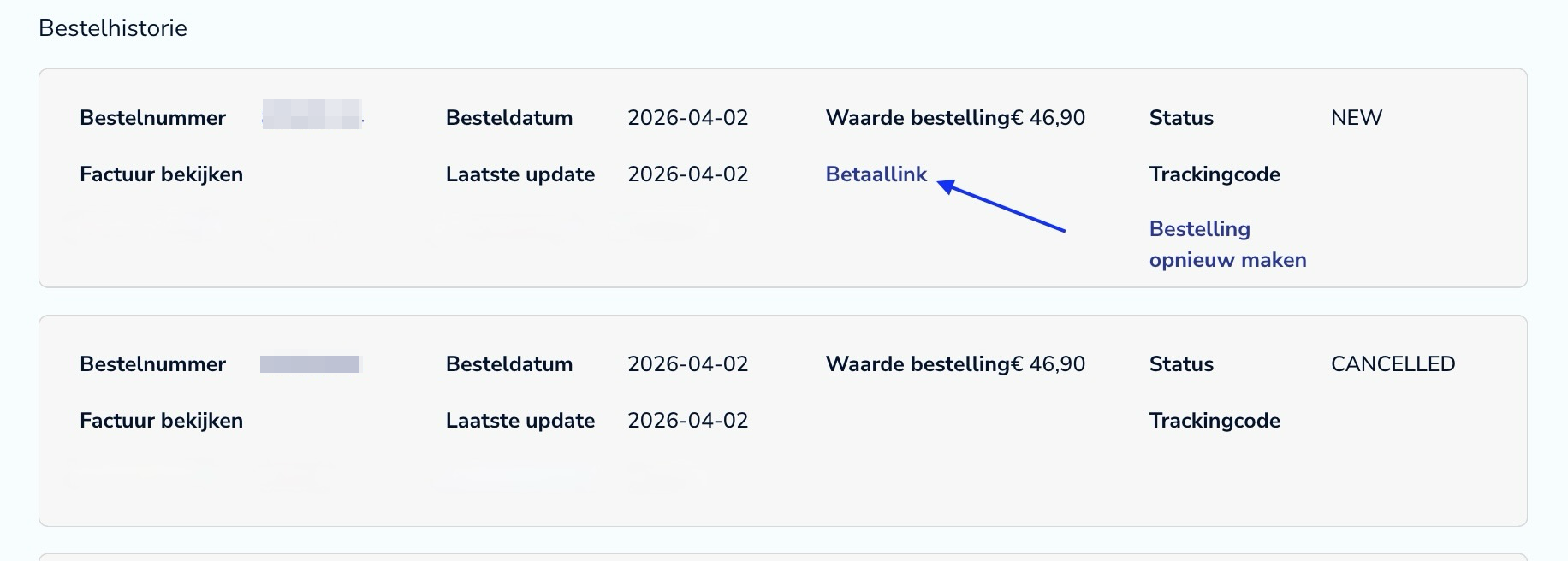 Scroll naar beneden naar uw bestelhistorie en zoek uw meest recente bestelling. Dit is de bestelling met de status "NEW", wat betekent dat deze nog niet is betaald. Klik vervolgens op de betaallink.