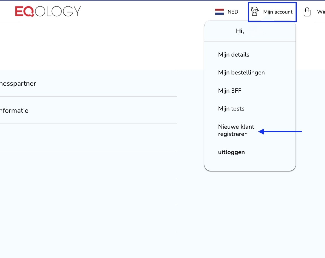 Om een nieuwe klant te registreren, klikt u rechtsboven op “Mijn account” en vervolgens op “Nieuwe klant registreren”.