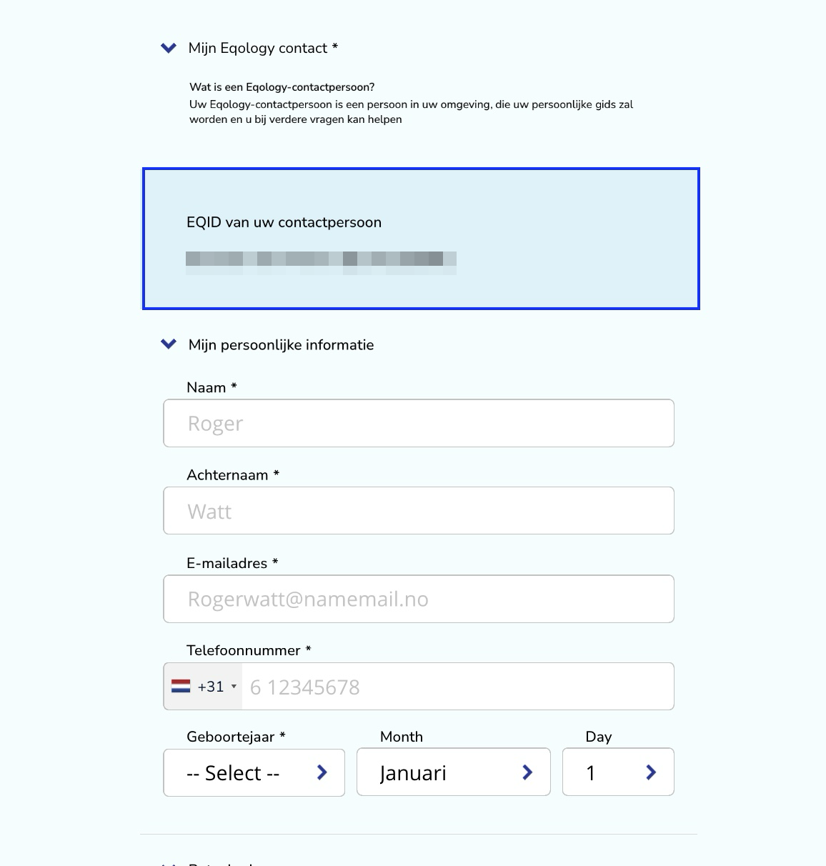 Let op: in het blauwe veld ziet u uw naam en uw eigen EQ ID-code. Als u hier een andere ID ziet, probeer dan uit te loggen en opnieuw in te loggen. Dit betekent dat het nieuwe account aan uw profiel wordt gekoppeld.