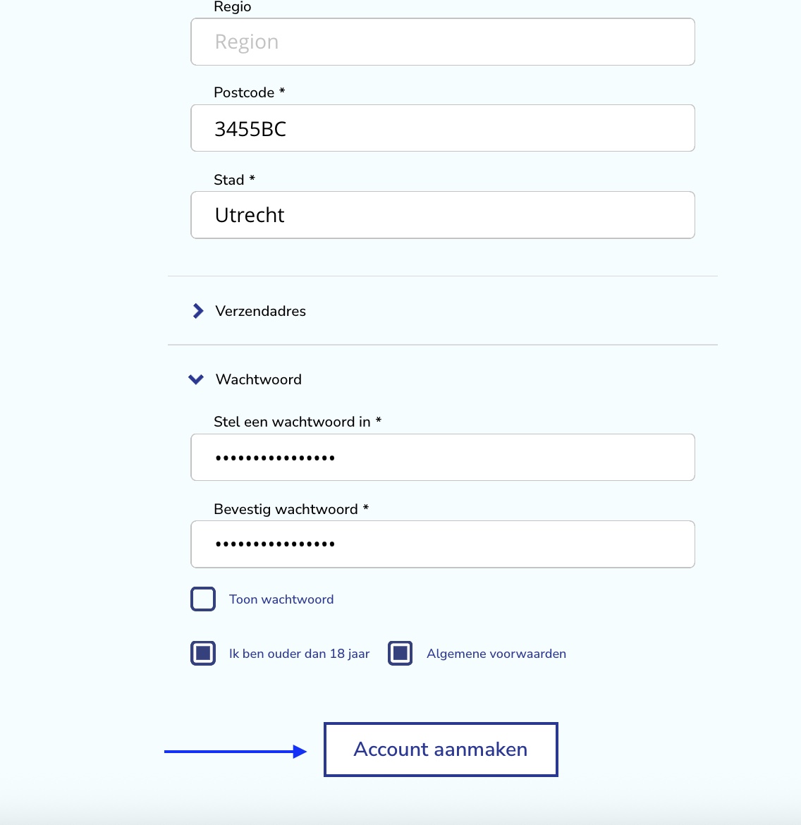 Wanneer u alle velden heeft ingevuld, vergeet dan niet het vakje “Ik ben ouder dan 18 jaar” en de algemene voorwaarden aan te vinken. Klik daarna op “account aanmaken”.