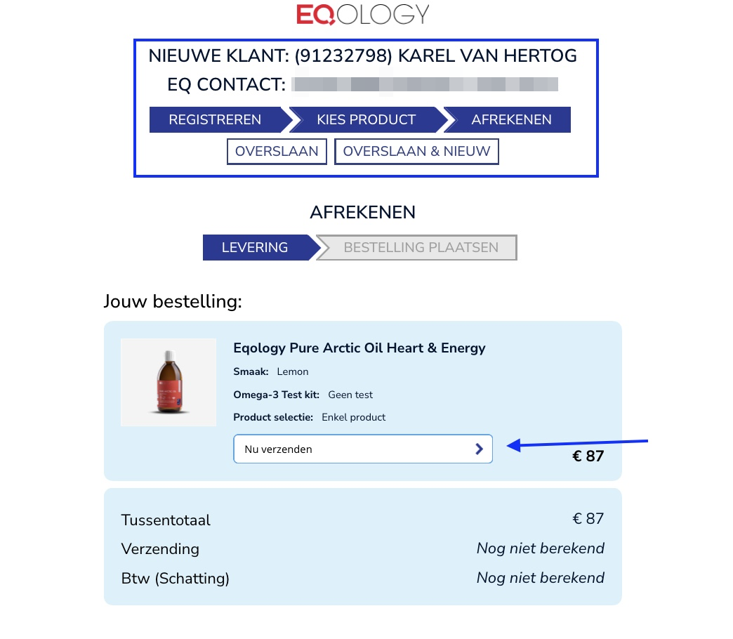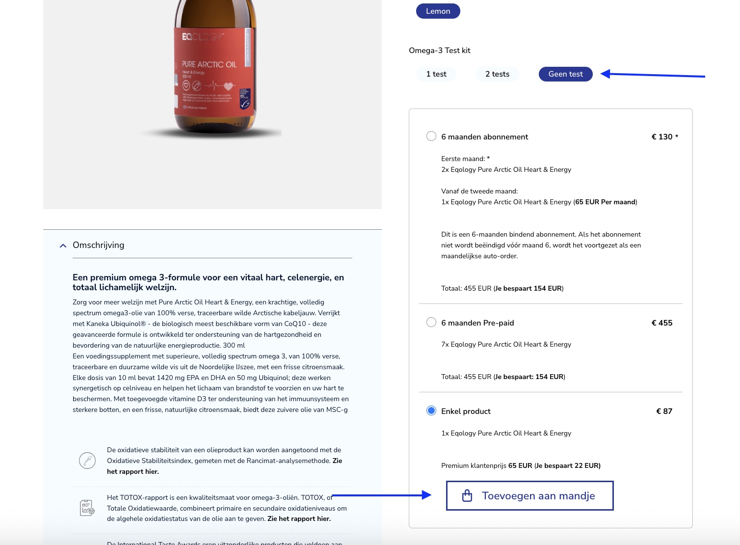 Stel dat uw klant een fles Eqology Pure Arctic Oil Heart & Energy wil bestellen om het als eenmalig product uit te proberen. Klik dan op de productafbeelding, selecteer de optie “Geen test” en kies een eenmalig product. Scroll vervolgens naar beneden en klik op “Toevoegen aan mandje”.